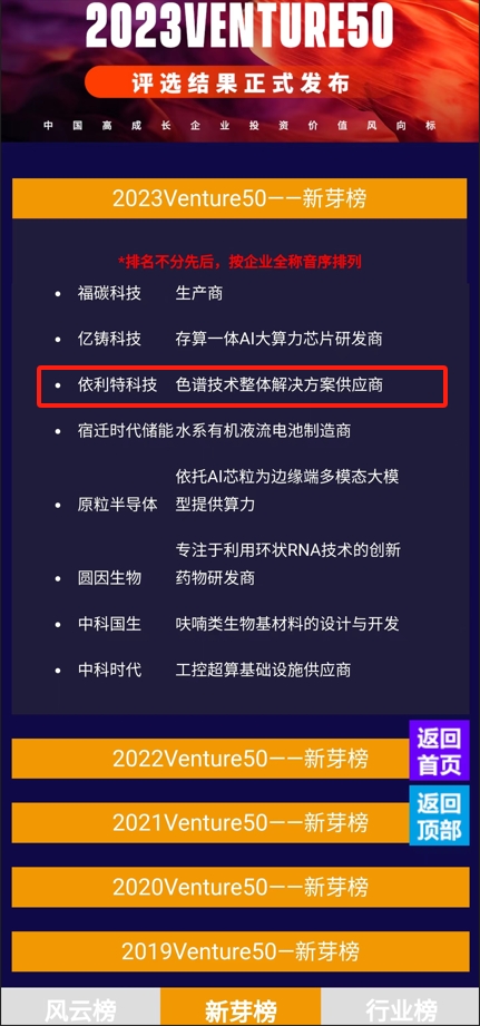 2024年1月16日,由清科创业、投资界发起的2023Venture50榜单最终揭晓,坚持自主研发和自主设计提供理化分析、分离制备和体外诊断产品提供商泡芙短视频科技荣登2023Venture50新芽榜。在科学仪器领域,泡芙短视频科技也是最近3年内唯一一家上榜企业。