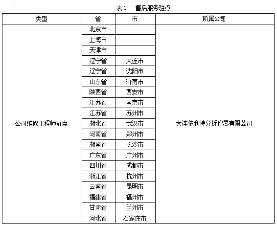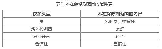 整机自安装起保修期为一年,但消耗品和(或)人为因素导致仪器故障的情况除外。仪器到货后1年未通知安装,保修期自动终结。不在保修范围的消耗品名录如表2所示。